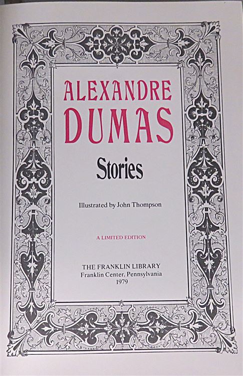 Hardback. A collection of stories from Alexandre Dumas, including The Count Of Monty Cristo. Beautifully bound by The Franklin Library in full red leather with gilt decoration to the sides and spine. All edges are bright gilt and complete with red silk endpapers and ribbon bookmark. The text perfectly enhanced by the colour illustrations of John Thompson. In very good condition despite light fading to the spine. pp. 385. Limited Edition, part of The Greatest Stories of The World's Greatest Writers series.