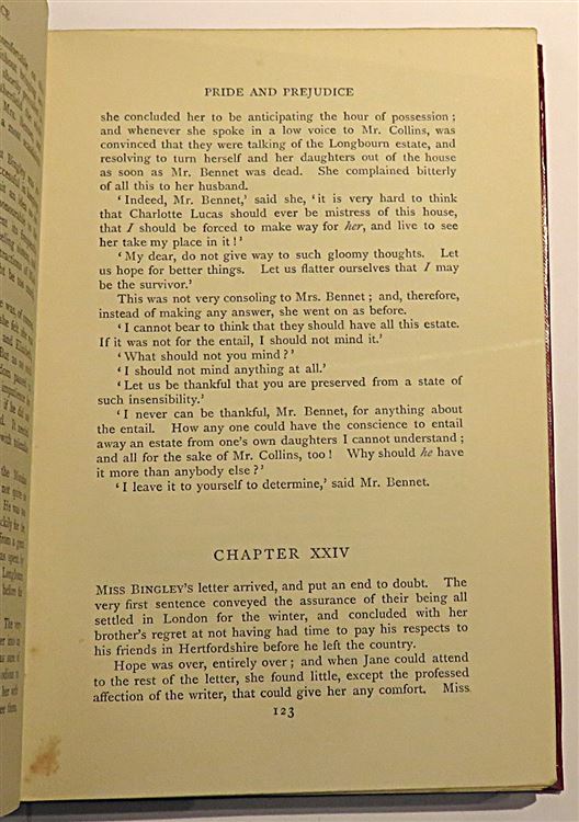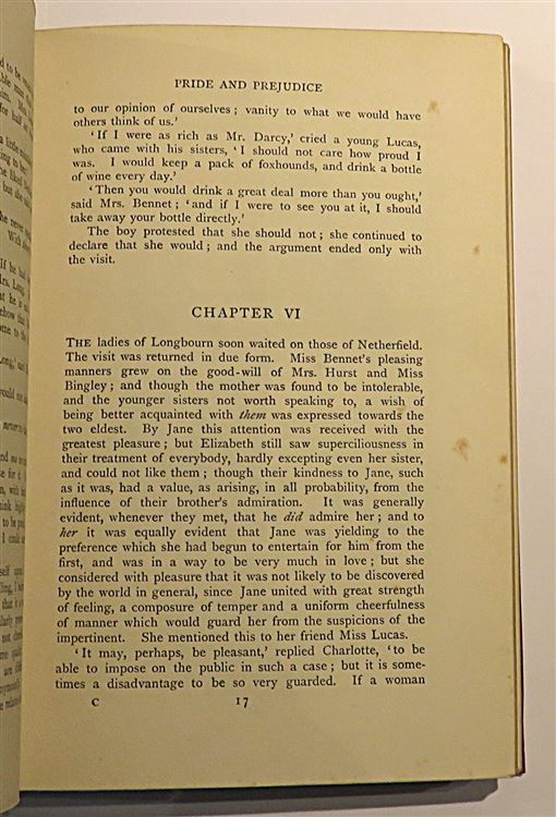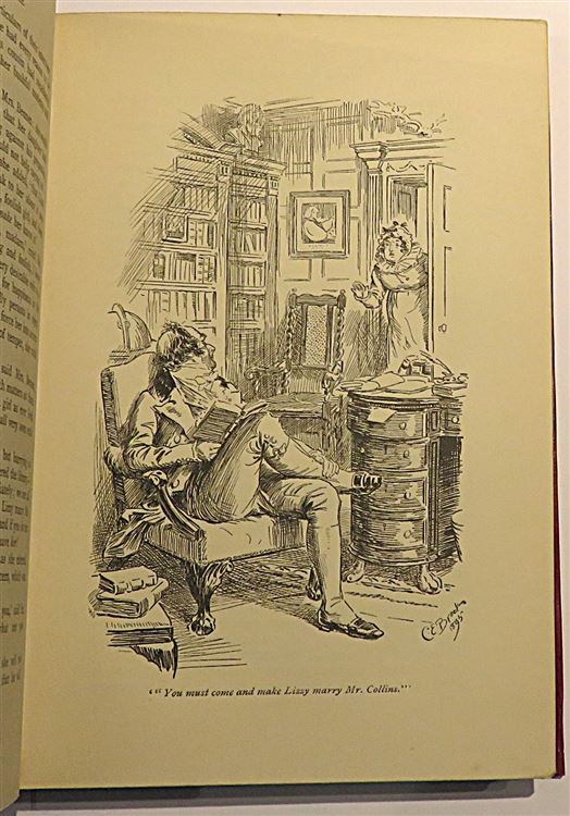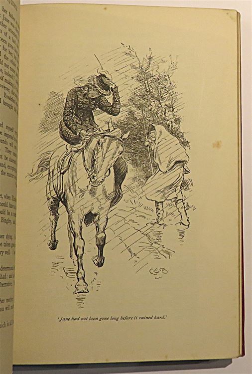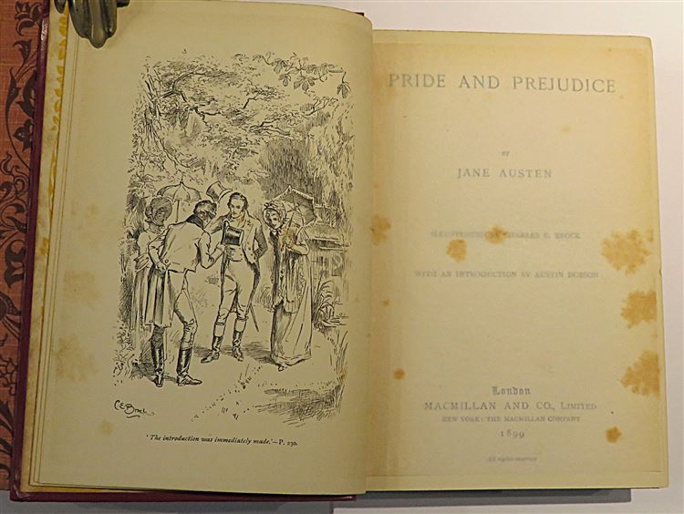 A stunning copy of Jane Austen's classic work. Beautifully bound in deep red cloth with intricate gilt design to the front and spine. All edges are gilt. Decorative yellow peacock endpapers and illustrations by Charles E. Brock. With an introduction of Austin Dobson. There is a little bumping to the corners of the binding with light fading and a slight lean to the spine. A touch of foxing to the pages especially to the prelims and towards the rear. Overall a very good copy with the binding, especially the front board clean and bright. No marks or bookplates to the endpapers and the pages are overall clean. pp. xxx + 352. The perfect gift idea for any Jane Austen fan.