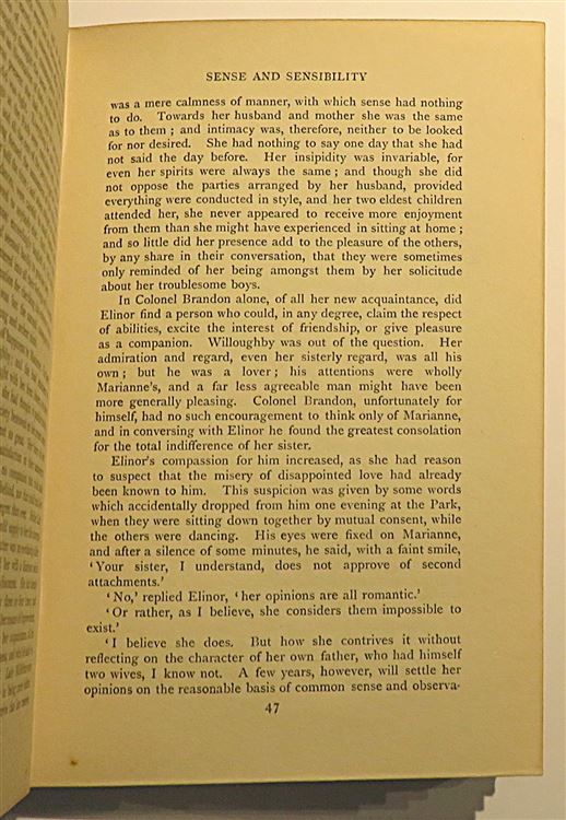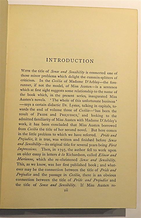 A beautiful edition of Jane Austen's first novel Sense And Sensibility. With illustrations by Hugh Thomson and an introduction by Austin Dobson. Bound in the publisher's original red cloth with printed floral detail to the front and spine. There is a little bumping to the corners and the spine has lightly faded with minor wear along the front hinge. The pages although foxed to the endpapers, prelims and towards the rear are very clean throughout. Overall though, a clean and bright copy with the binding particularly sharp. pp. xvi + 342 + 2. A beautiful copy which would make the perfect gift for any Jane Austen fan.