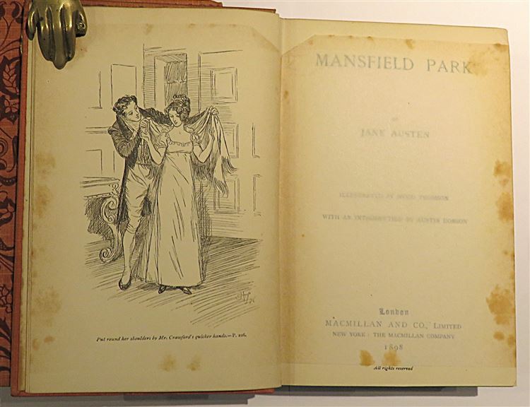 A beautiful copy bound in the publisher's original red cloth with printed floral design to the front and spine. All edges are gilt. Beautifully illustrated by Hugh Thomson and with an introduction by Austin Dobson. A good copy with the binding still fresh and sharp despite minor bumping to the corners and light fading to the spine. There is a little foxing to the endpapers, prelims and towards the rear, however the pages are generally clean. pp. xviii + 429 + 2. A lovely copy. The perfect gift for any Jane Austen fan.