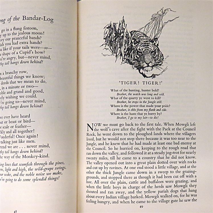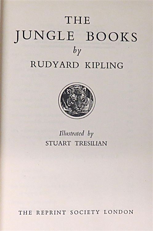 This lovely green clothbound hardback edition of "The Jungle Books" by Rudyard Kipling includes both the first and second jungle books. The book is handsomely presented, with a charming gilt illustration of an elephant on the cover, gilt lettering and decoration to the spine, and a burnt orange stain to the top edge. Stuart Tresilian's black ink illustrations feature throughout the book, and add a sense of whimsy to these well-loved children's stories. This book has 320 pages of text, and despite some fading to the detail on the spine, and some minor foxing throughout, it remains in good condition. This book is looking for a new home, and would be the perfect gift for any Kipling enthusiasts.