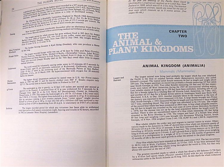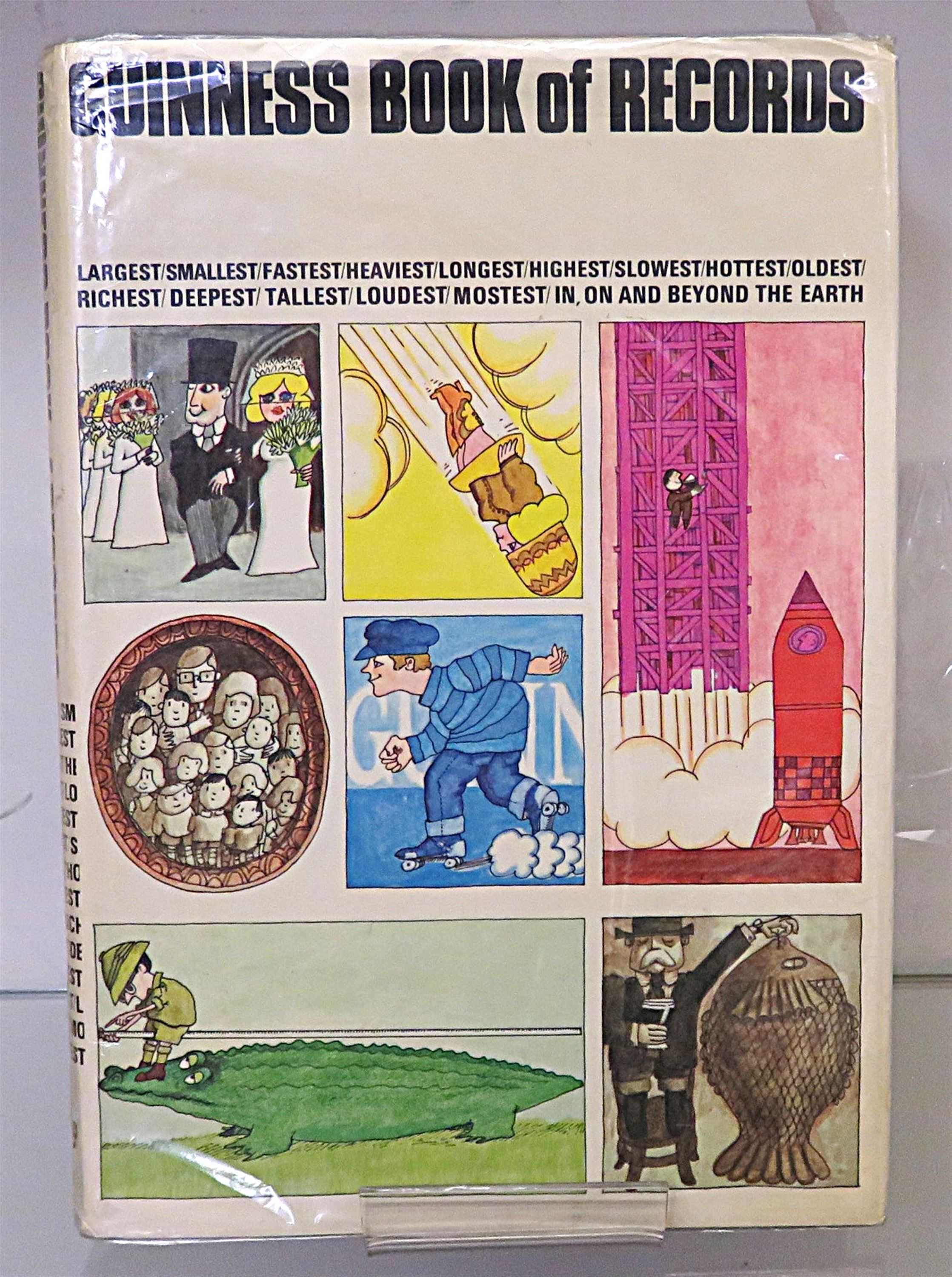 This 1968 hardback edition of the Guinness Book of Records is looking for a new home. This book is complete with its original dustjacket, which has numerous brightly coloured and whimsical illustrations that reference the records inside the book, such as a man measuring the length of a crocodile. The book itself is bound in a handsome grey cloth, and is complete with gilt lettering and decorations to the cover and spine. Inside the book, one finds full-colour and black and white photos and illustrations. This book contains 350 pages of text, and despite it's age it is in great condition - the interior of the book appears mostly untouched. This is a wonderful collectors item that would make for the perfect gift for any fans of the Guinness Book of Records.